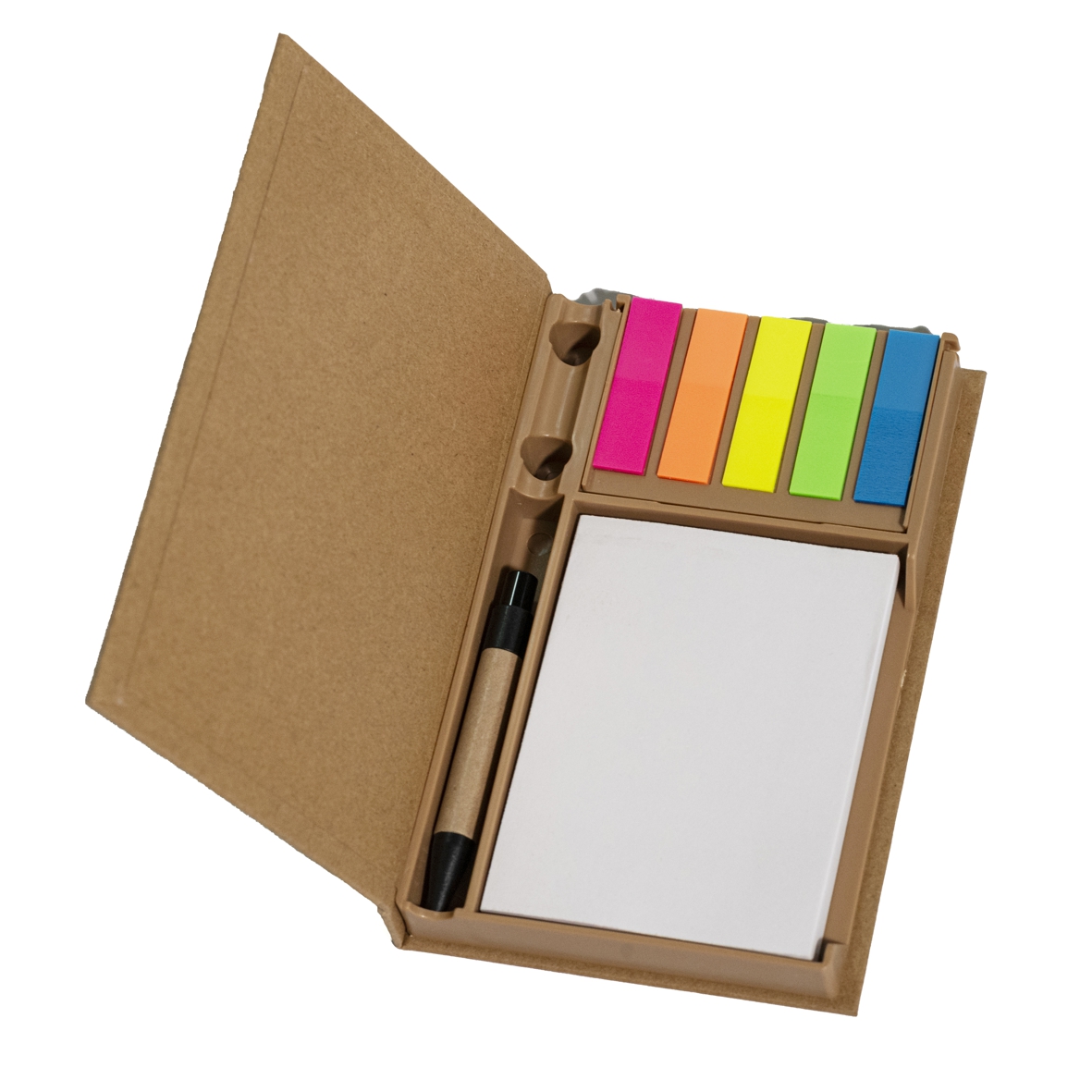 Ecológico material kraft, com 100 folhas brancas, 5 marcadores autoadesivos coloridos, 7 clips e uma mini caneta de papelão escrita azul. Com espaço para armazenar a caneta e dois suportes porta-caneta. Dimensões: 16,3cm altura, 10,6cm largura. Personalização COLOR