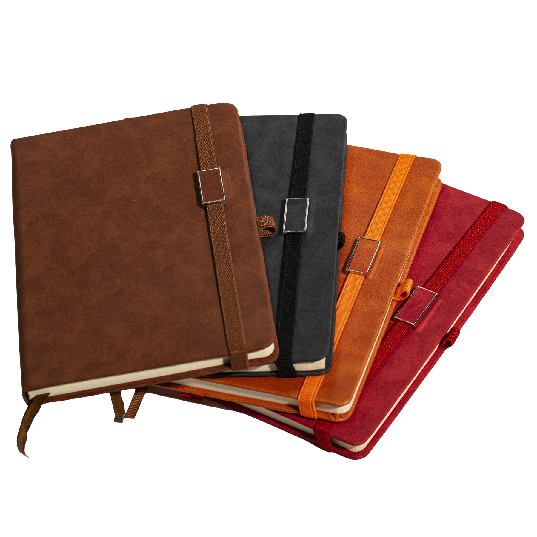 Caderneta capa emborrachada com 96 folhas s/ pautas, Suporte para caneta, Marcador de página, Plaquinha para personalização. Tamanho: 21,00 x 14,50 cm. Impressão digital color.