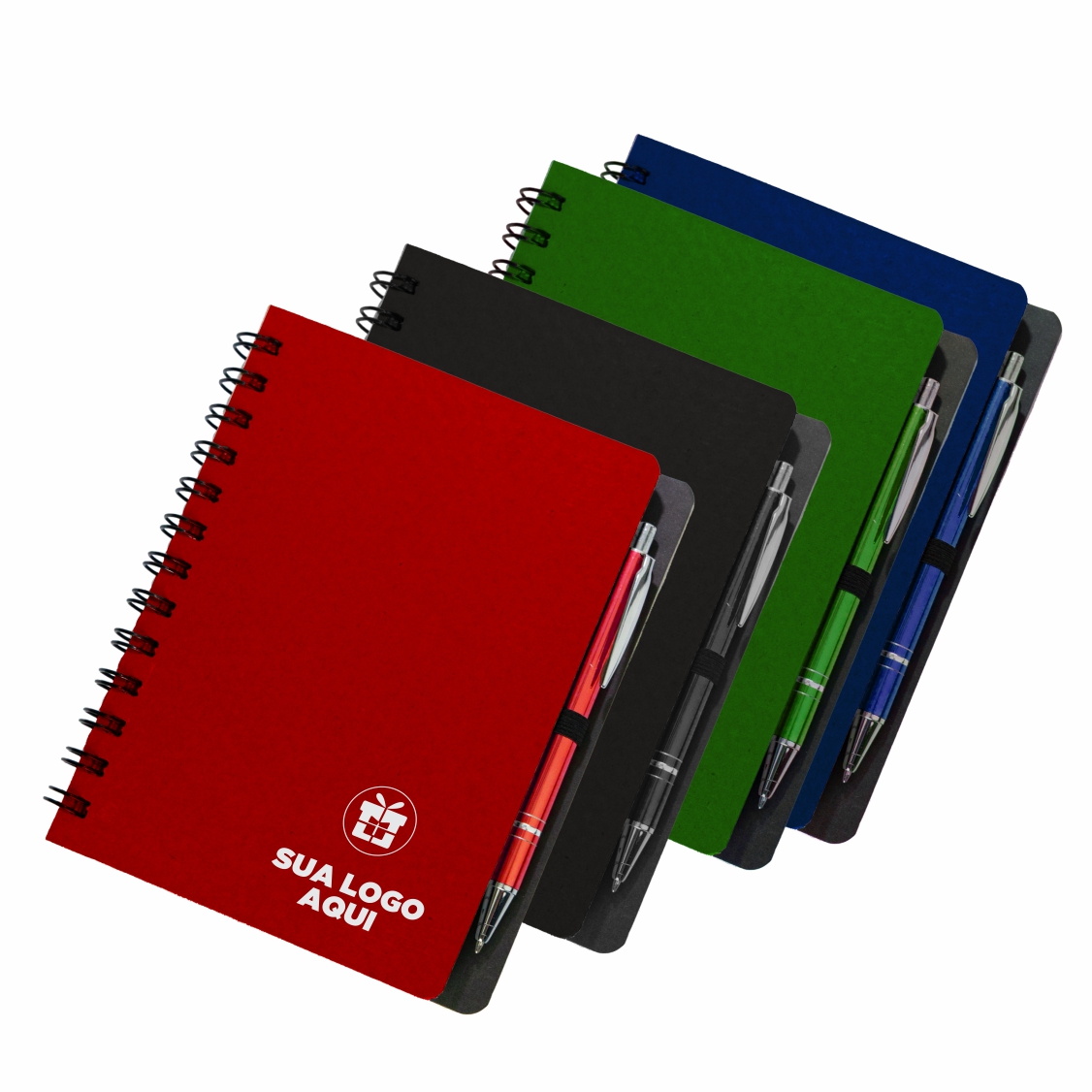 Capa dura em Kraft, acabamento em wire-o, formado fechado 8,5x14cm, miolo em papel off-set 70g. Caneta não incluso. Impressão Silk Screen até 02 cores.