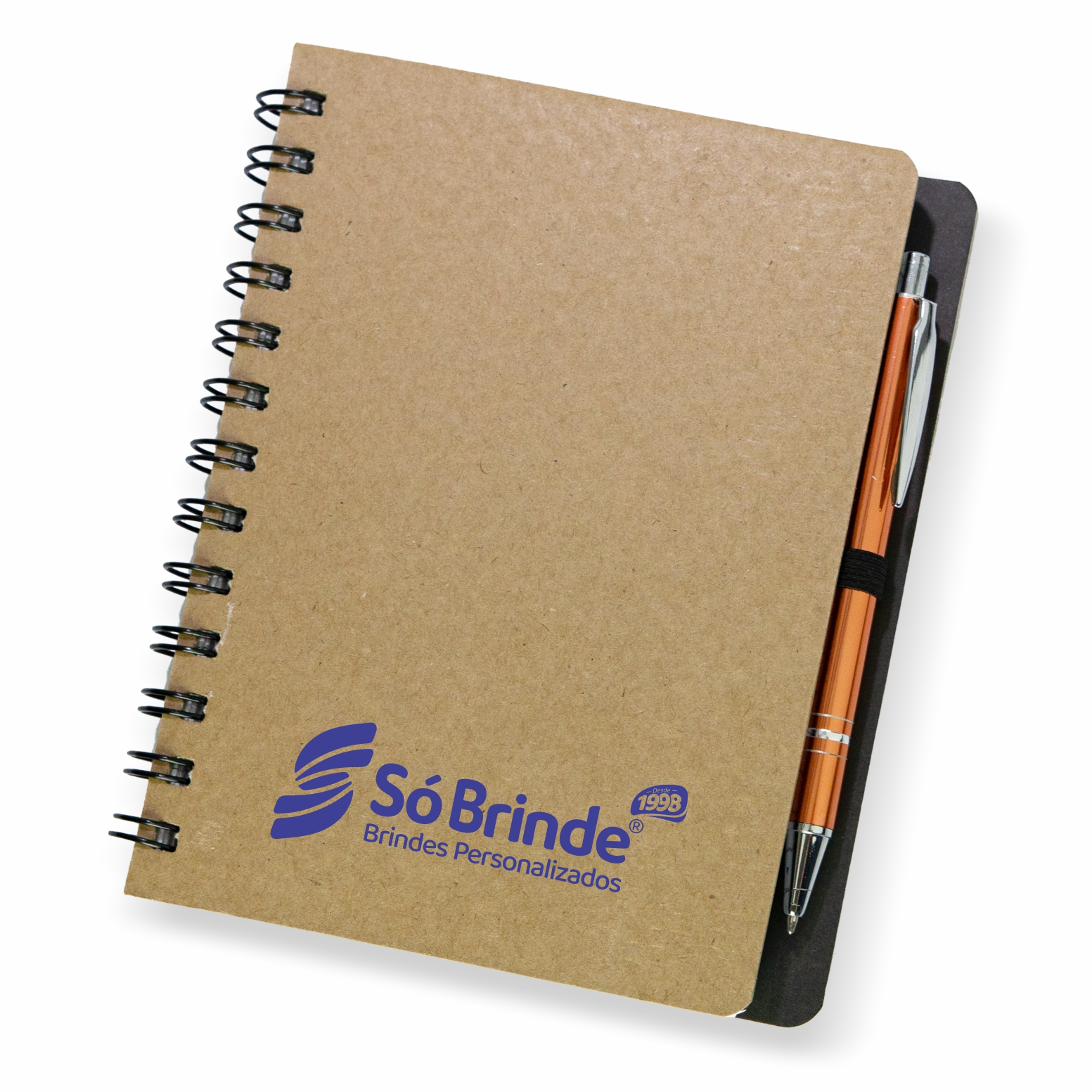 Capa dura em Kraft, acabamento em wire-o, formado fechado 12x17,5cm, miolo em papel off-set 70g. Caneta não incluso. Impressão Silk Screen até 02 cores.