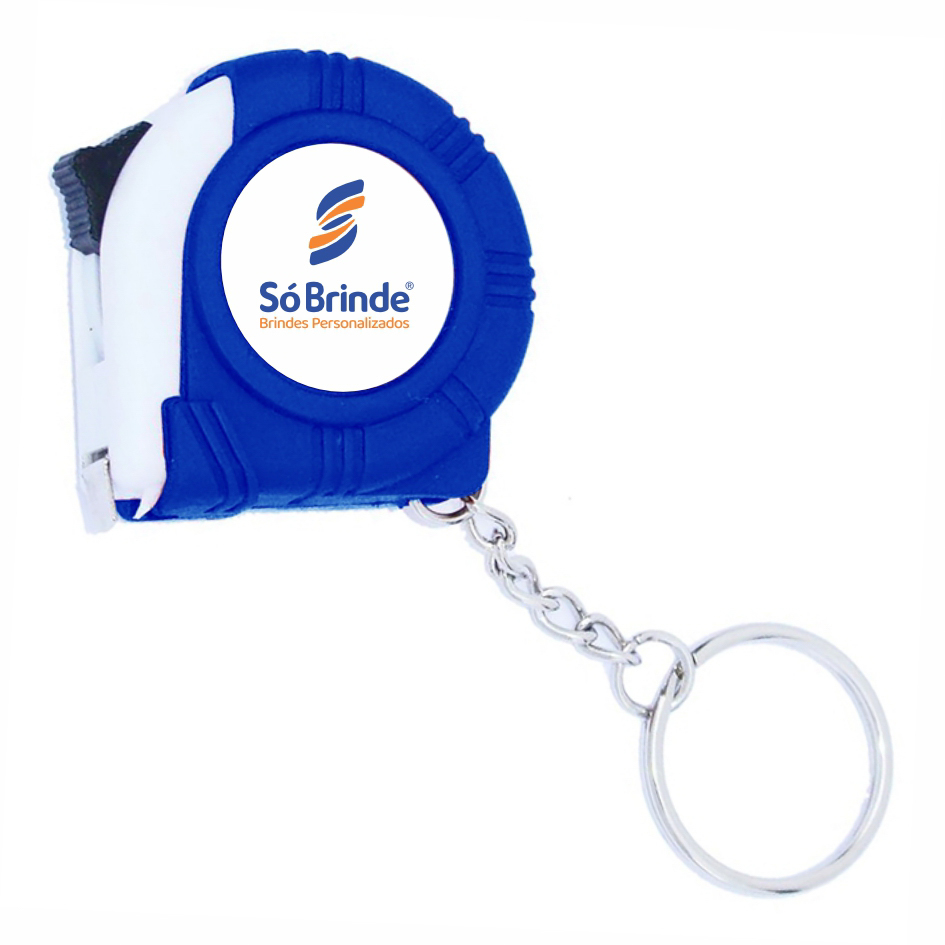 Chaveiro trena de 1 metro em plástico quadrangular, frente lisa e verso com botão (trava). IMPRESSÃO DIGITAL COLOR.